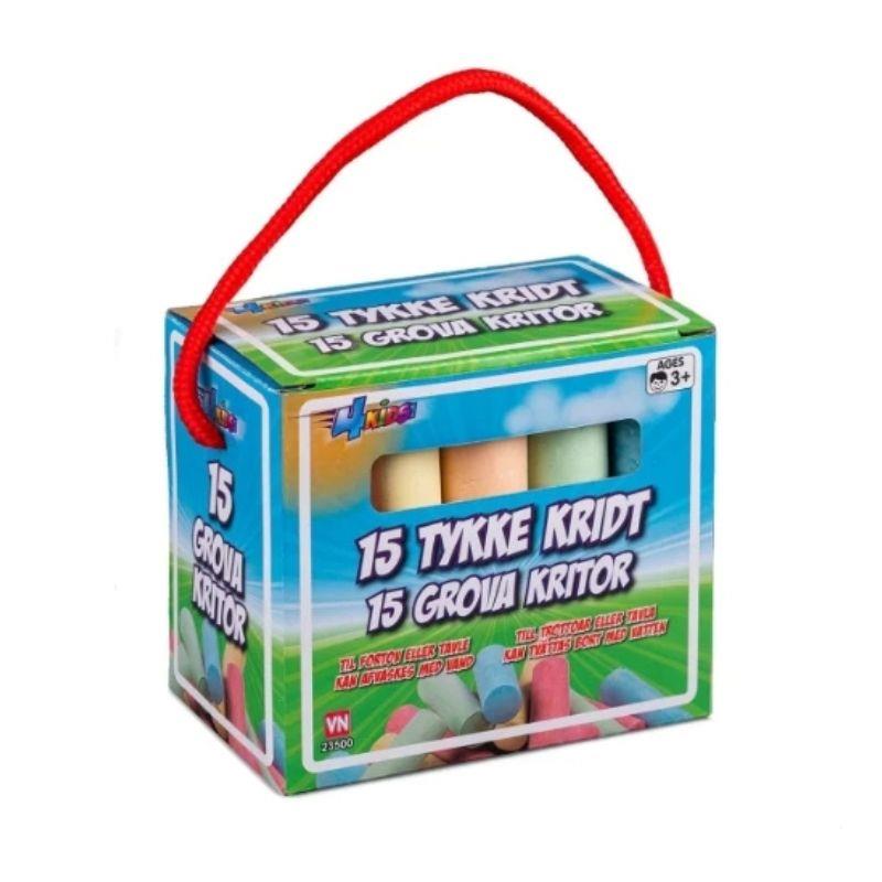 Gør fortovet til et farvestrålende galleri med dette lækre kridtsæt fra 4-Kids. Her får du 15 ekstra tykke kridt i en praktisk og farverig papæske, der er nem at have med overalt takket være den solide bærehank i snor. Kridtene er skabt til store armbevægelser og masser af leg i det fri, uanset om der skal dekoreres fliser i haven eller tegnes kørebaner i skolegården.