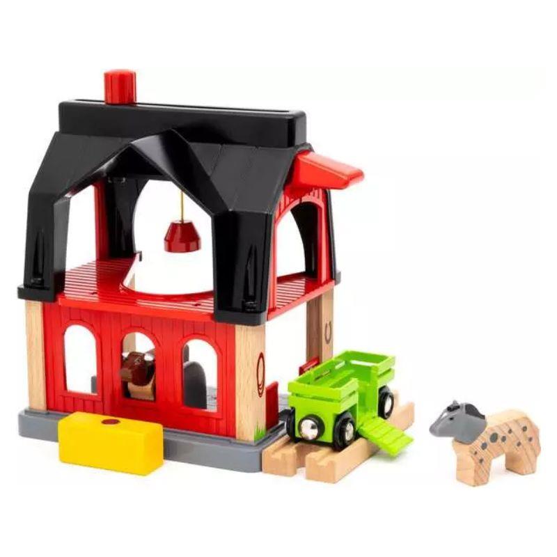 Giv dine BRIO World dyr et godt sted at være ned Stald til dyr. Der er masser af plads indeni til alle dine dyrevenner samt opbevaringsplads til deres foder på loftet. Brug hølæssefunktionen på taget af stalden til at flytte dyrefoderet fra vognen nedenunder og op i sikkerhed på loftet. Byg dette tilbehør til togbanen sammen med en større bane, og du kan altid bruge vognen til at transportere dyrene rundt i din BRIO World.
