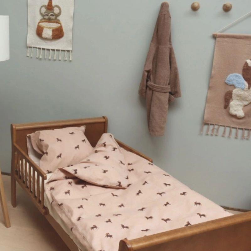 Sættet prydes af et enkelt og stilrent enhjørningsprint, der bringer et strejf af magi til puttetiden uden at virke forstyrrende. Kvaliteten er helt i top, da sengetøjet er fremstillet i blød bomuld, som sikrer, at dit barn ligger behageligt og lunt hele natten igennem.