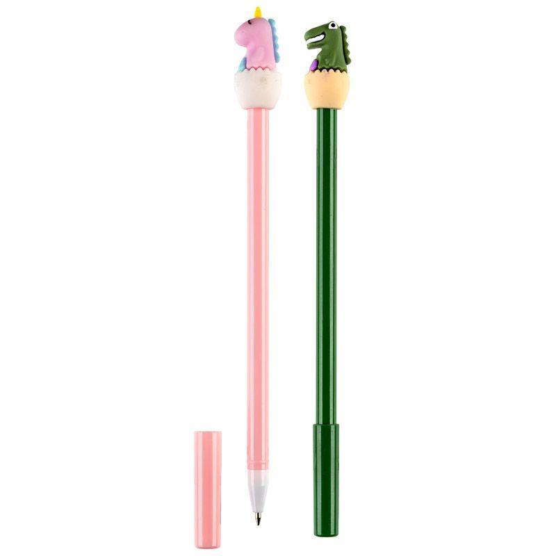 Assorteret kuglepen med dino på toppen. Blå blæk.