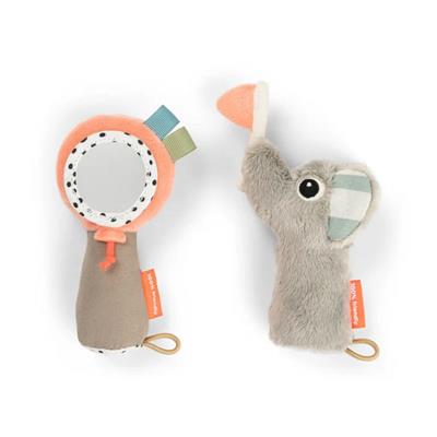 Den ene rangle forestiller Deer friend Elphee, der fejrer, og byder på blide ranglelyde og fine knitre-detaljer, som vækker nysgerrigheden. Den anden rangle indeholder et spejl, der inviterer barnet til at opdage sit eget spejlbillede. Taktile overflader, farverige elementer og små lyde stimulerer både syn, hørelse og berøring, mens greb, koordination og håndkontrol styrkes gennem leg. Et enkelt og engagerende sæt, der gør den tidlige leg både sjov og udviklende.