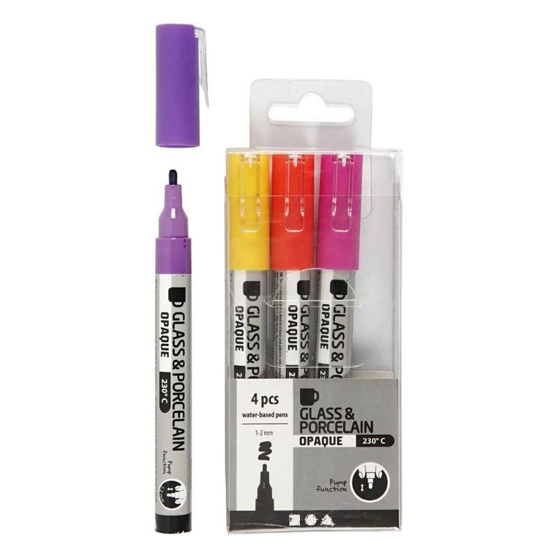 Pakke med fire vandbaserede, semidækkende glas- og porcelænstuscher i farverne rød, lyserød, gul og lilla. Tuscherne har pumpespids og efter varmehærdning i ovn, tåler det dekorerede emne maskinopvask og daglig brug.