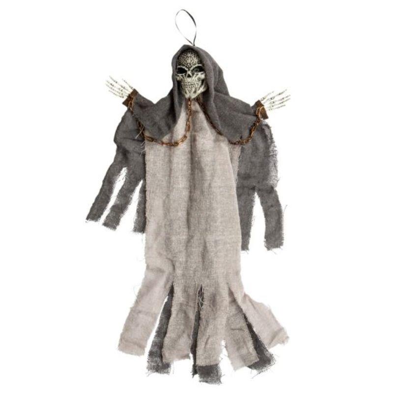 Det perfekte skræmmende dekorationsobjekt til at skabe en uhyggelig atmosfære til din Halloween-fest! Denne grå figur, der forestiller en død, hænger dramatisk fra loftet eller i et hjørne og tilføjer et spøgelsesagtigt præg til dit hjem.