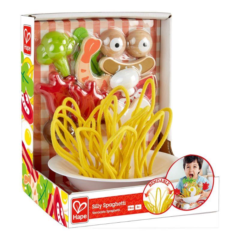 Lad legen blive skør med Hape Silly Spaghetti! Sæt farverige træ-“spaghettistrimler”, som kan bøjes, drejes og formes efter fantasien — pynt dem med tomat, ost, kødboller og greb, så du kan lave din egen “pastaret” i legestilen. Perfekt til rolleleg, stimulerer kreativitet, finmotorik og sensorisk leg. Et sæt med humor og farver, som giver både grin og læring.