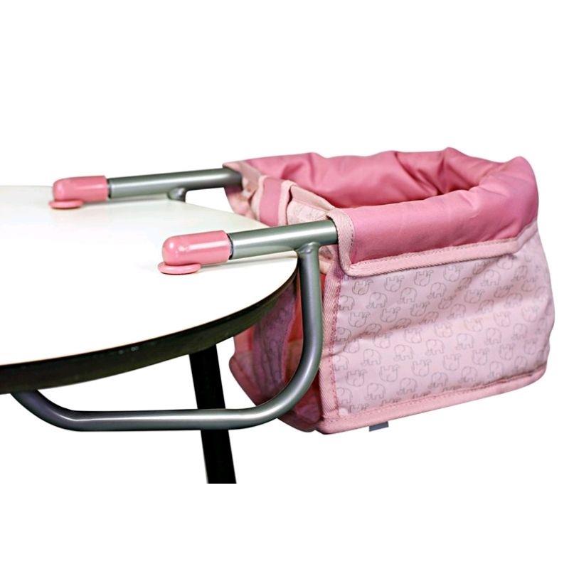 Denne smarte højstol kan du sætte på bordet og have med dig overalt, så din dukke kan være med til at spise sammen med resten af familien. Stolen er lyserød med et fint mønster.