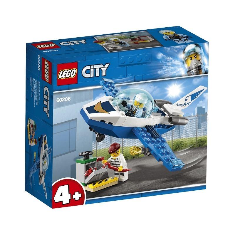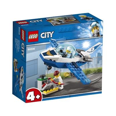 Tag med politiet på patrulje i luften! Sættet består af et sejt legetøjsjetfly med et minifigurcockpit, der kan åbnes, projektør og et særligt startklodselement, der gør byggeopgaven let at starte på.