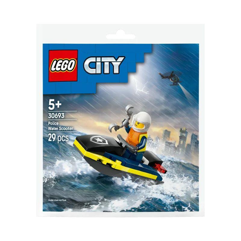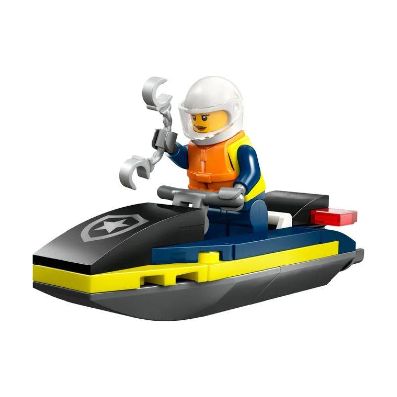 Sættet inkluderer en politibetjent-minifigur med redningsvest, hjelm og håndjern – klar til spændende missioner på bølgerne.