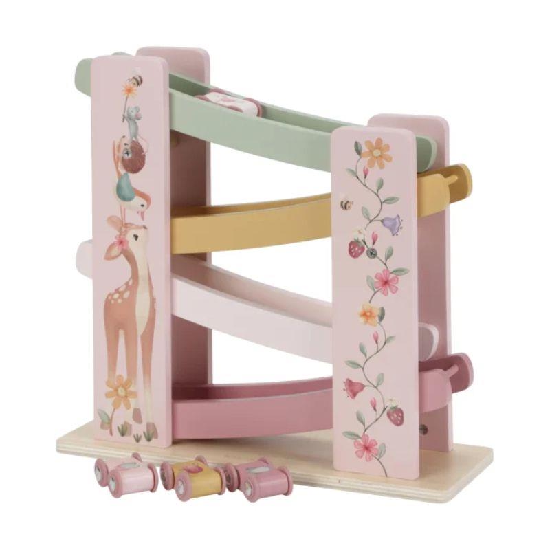 Little Dutch Ramp Racer – Fairy Garden er en charmerende træ-racerbane med fire dejlige skovvenner, der suser ned ad rampen og skaber leg og motorisk udvikling i én farverig oplevelse.