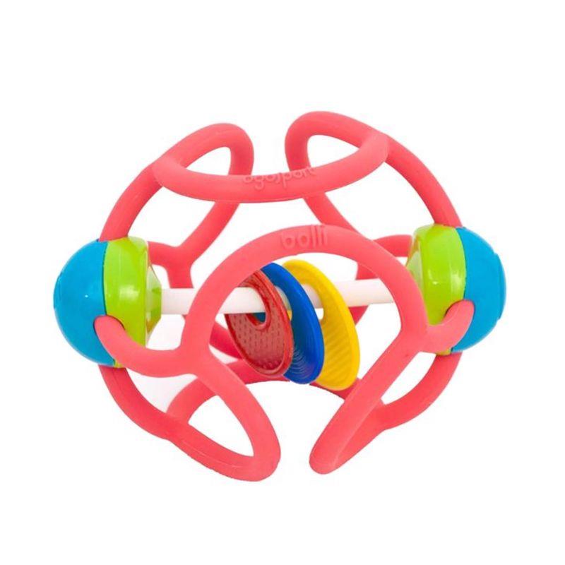 Oball biderangle i lyserød er et fleksibelt og let aktivitetslegetøj, som er perfekt til små hænder og ømme gummer.