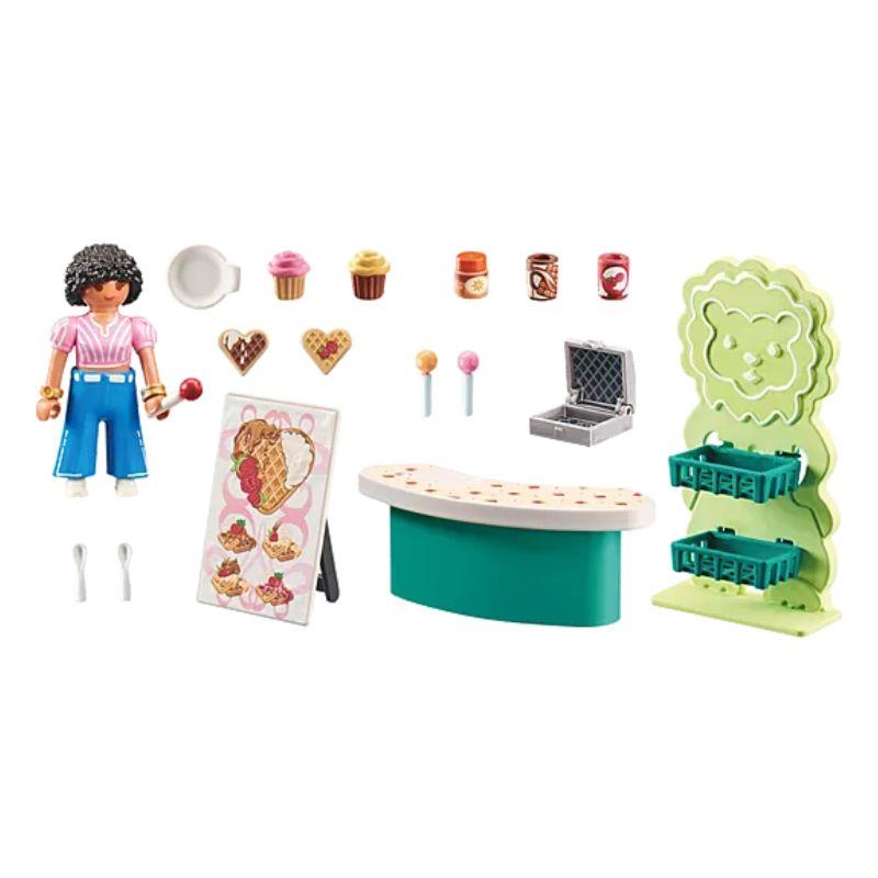 Slik gør livet sødere! PLAYMOBIL-slikboden tiltrækker store og små med friske vafler, cupcakes og slikkepinde. Uanset om vaflerne serveres med flormelis, æblemos eller chokoladecreme, er de simpelthen lækre! Efter sådan en godbid bliver det dobbelt så sjovt at shoppe.