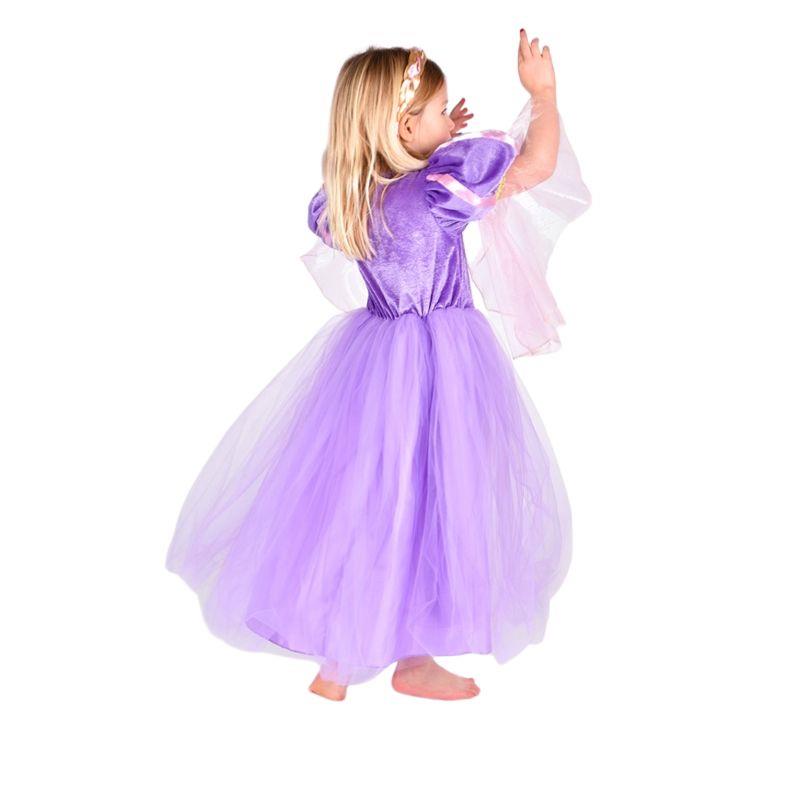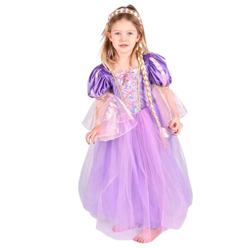 Rapunzel-prinsessekjole med tylskørt og pallietter. Med kjolen medfølger der en fletning - ligesom Rapunzel også har.