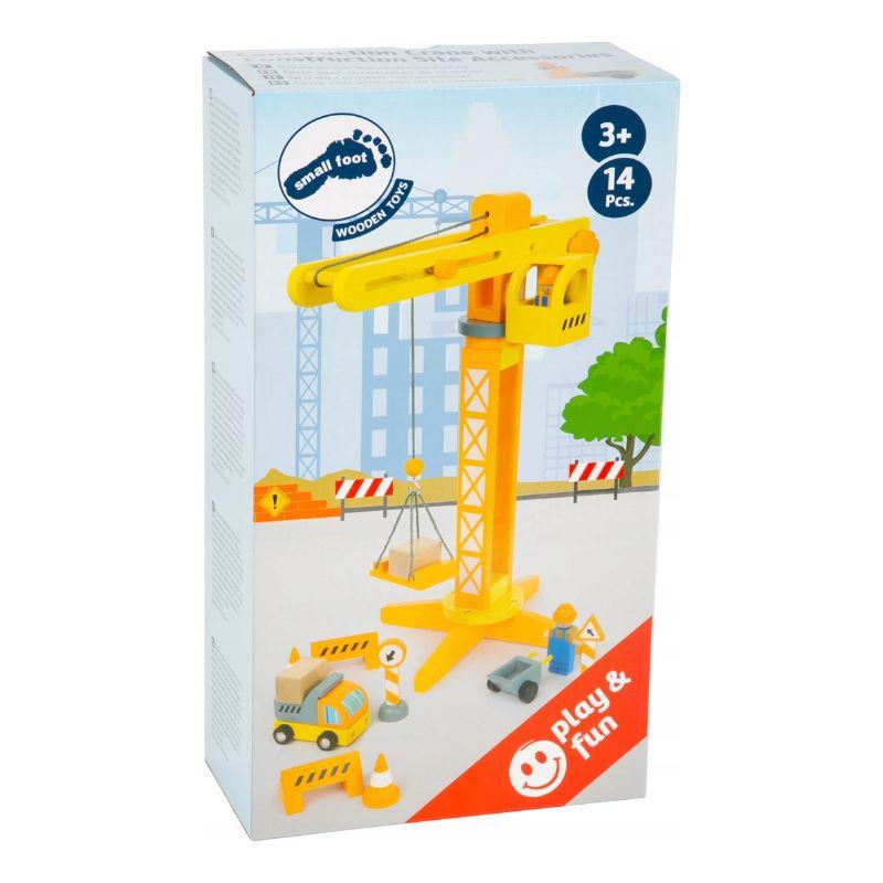 Sæt byggepladsen i gang med denne robuste trækran komplet med et tilhørende tilbehørssæt! Kranen kan dreje 360°, armene kan bevæges, og med krogen og transportplatformen kan små byggearbejdere flytte materialer fra ét sted til et andet. Tilbehøret — skilte, afspærringer, spande og figurer — gør legen realistisk og underholdende. Hele sættet opfordrer til rolleleg, kreativ tænkning og finmotorisk udvikling.